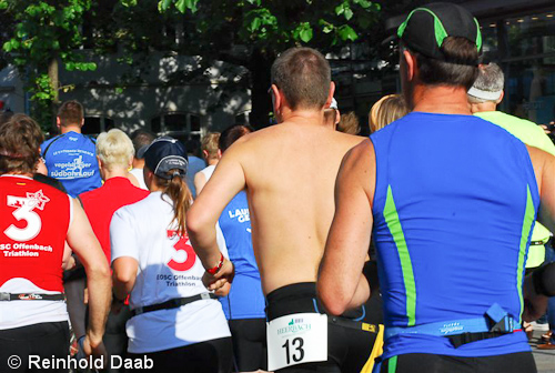 Kurz vor dem Start hatten wir uns in der Nähe des Start-Banners eingefunden - zusammen mit ca. 200 anderen Teilnehmern, die sich links und rechts im Schatten der Fußgängerzone rumdrückten. Okay... das Ganze wird offensichtlich sehr übersichtlich