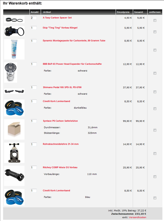 Hier mein bisheriger Warenkorb. Ob ich dort bestell oder wo anders muss ich noch schaun. Hat noch irgendwer Anregungen was sinnvoll wär oder besser? :lookaroun: