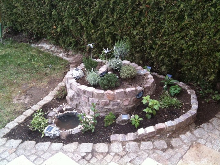 Anbei noch ein Foto meiner bepflanzten Kräuterspirale. Jetzt muss ich noch den Rasen schön machen....