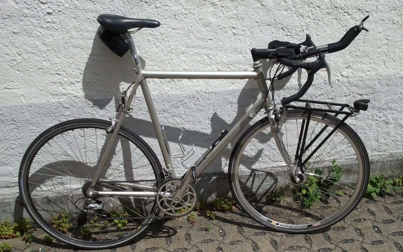 Ausgestattet mit einem Rennlenker und 25mm Schwalbe Marathon Plus sind auch schlechte Rad- und gute Feldwege sein Zuhause. Auf normalen Landstraßen kann man entspannt in der Aeroposition dahin rollen, dabei Kilometer um Kilometer fressen. Dabei hat man immer das Gepäck vorne auf dem Gepäckträger im Auge, bemerkt eventuelle Ausreißversuche früh- und rechtzeitig. Auch eine zentimetergenaue Positionierung der Packtaschen, um Kollisionen mit den eigenen Hacken zu verhindern, ich lebe ja auf großem Fuße, ist so nicht notwendig. Eine 185mm Kompaktkurbel bietet ein großes Spektrum an Gängen, die man auf weiter Fahrt mit Gepäck auch braucht, ohne die sportive Optik des Rades weiter zu verwässern. Das Setup wird durch eine Lichtanlage mit Nabendynamo und den tollen Leuchten von B+M abgerundet, so dass es kein Problem ist, wenn's mal wieder etwas länger dauern sollte.