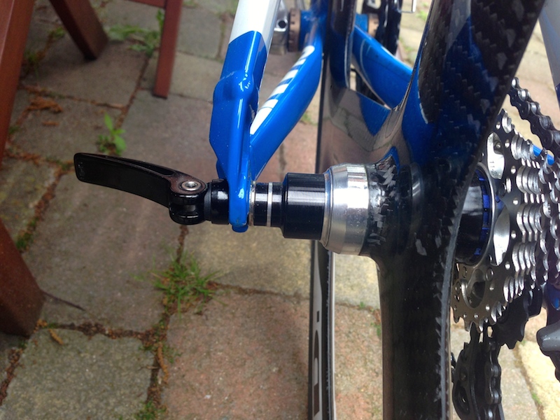 Diverse Laufräder passten wunderbar in die Ausfallenden, ein bestimmtes Laufrad nicht. Problem: Zu viel Farbe in den Ausfallenden, so dass die Achse auf der einen Seite nicht ganz rein ging. Waren nur wenige Zehntel Millimeter. Lösung: Schlüsselfeile genommen und die Farbe soweit weg gefeilt, dass ich das Rad bzw. die Achse gerade und leicht einsetzen konnte. :smokin: